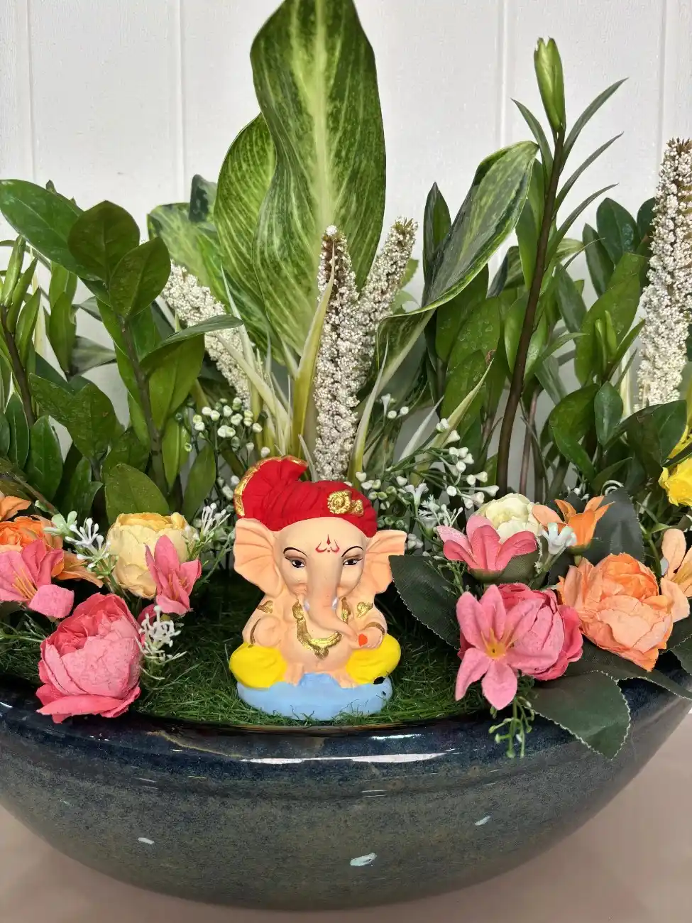 Vastu Nauka Ceramic Boat Pot with Real & Artificial Plants, Aglonema, ZZ Plant & Ganesh Idol – Festive Décor