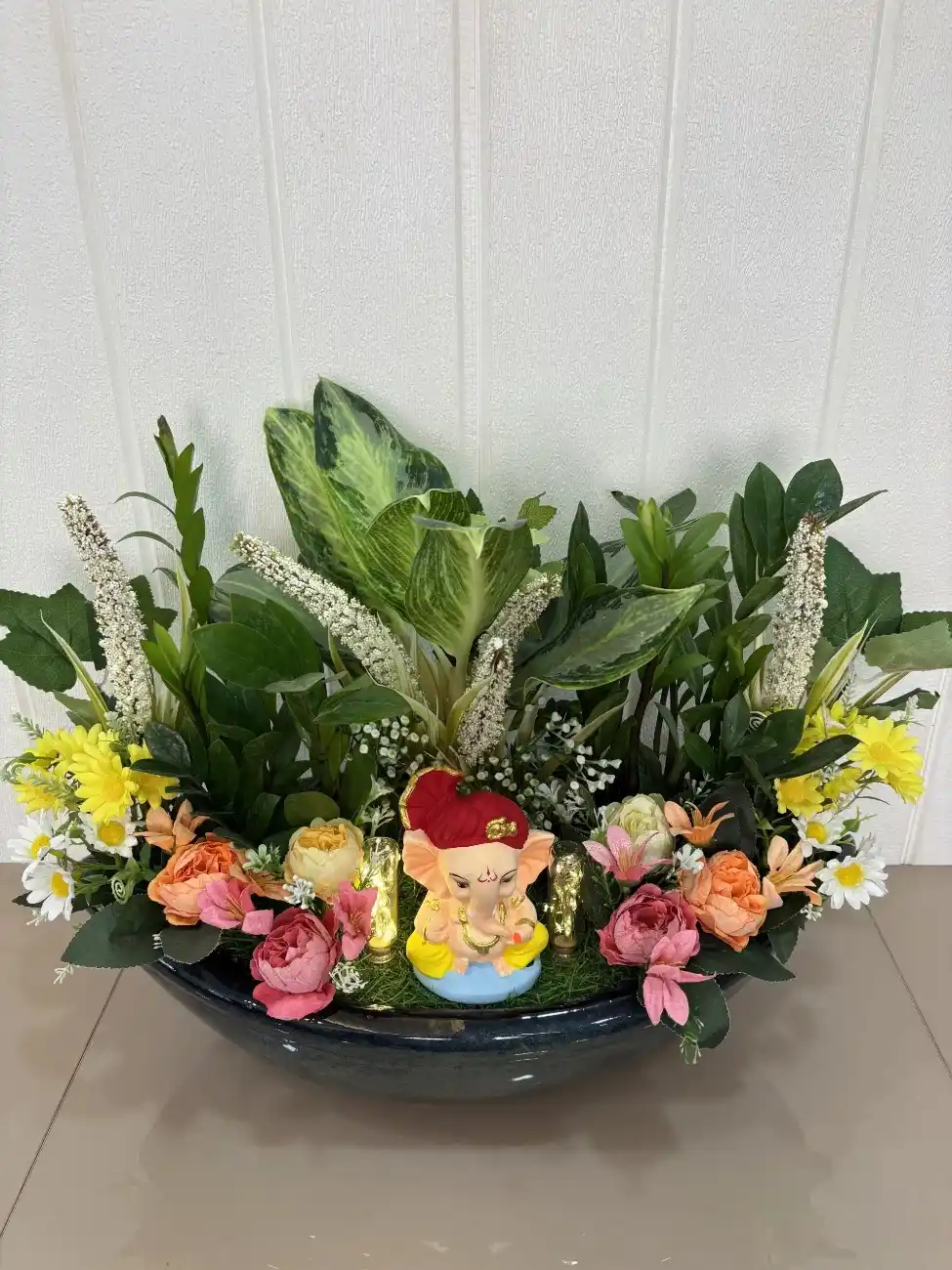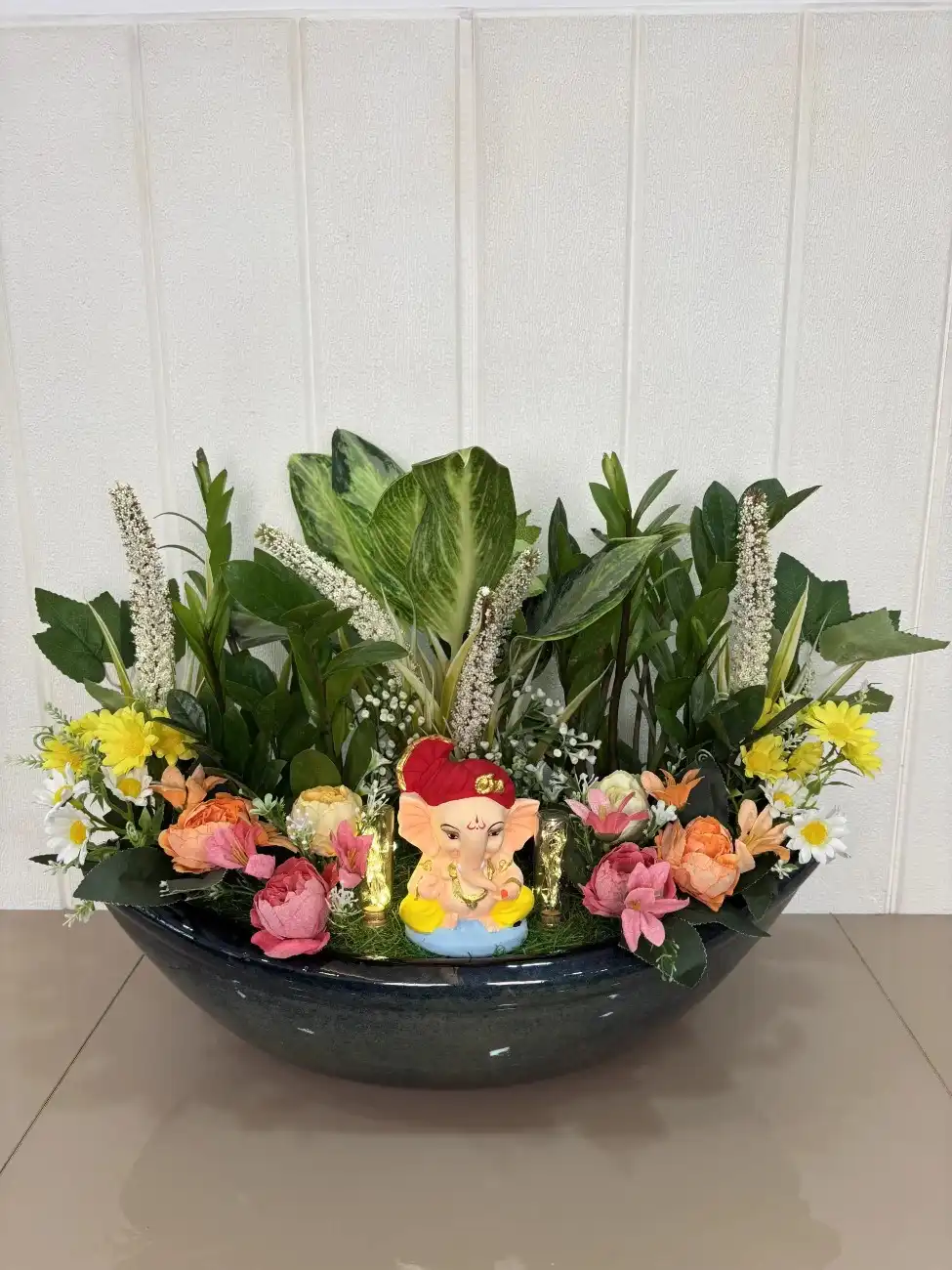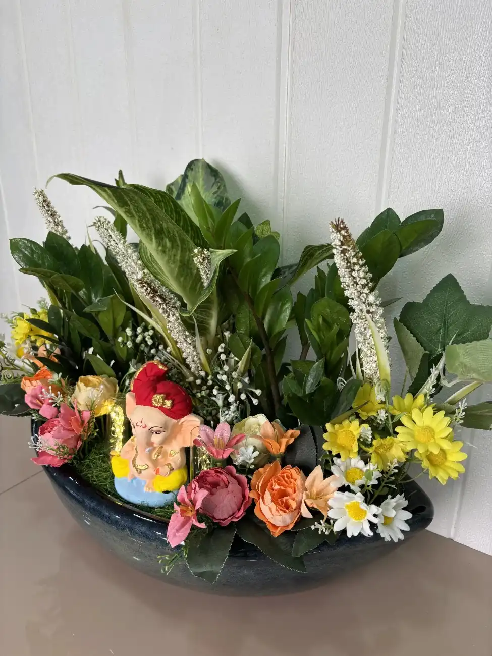 1 review for Vastu Nauka Ceramic Boat Pot with Real & Artificial Plants, Aglonema, ZZ Plant & Ganesh Idol – Festive Décor