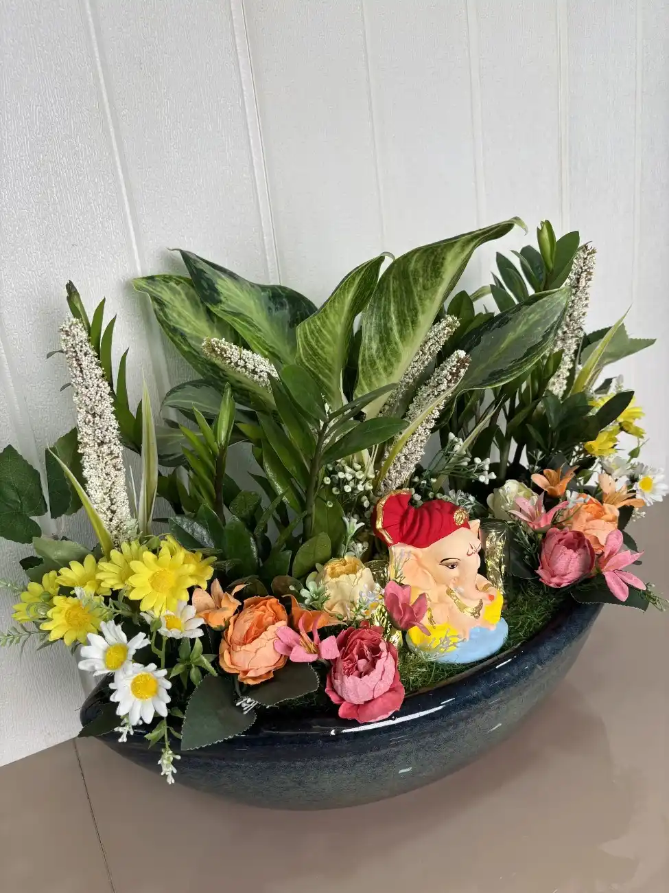 Beautifully arranged with a mix of real and real-like artificial plants, including Aglonema and ZZ plants, it radiates natural positivity and freshness. The addition of vibrant artificial flowers gives it a colorful festive charm that lasts forever.