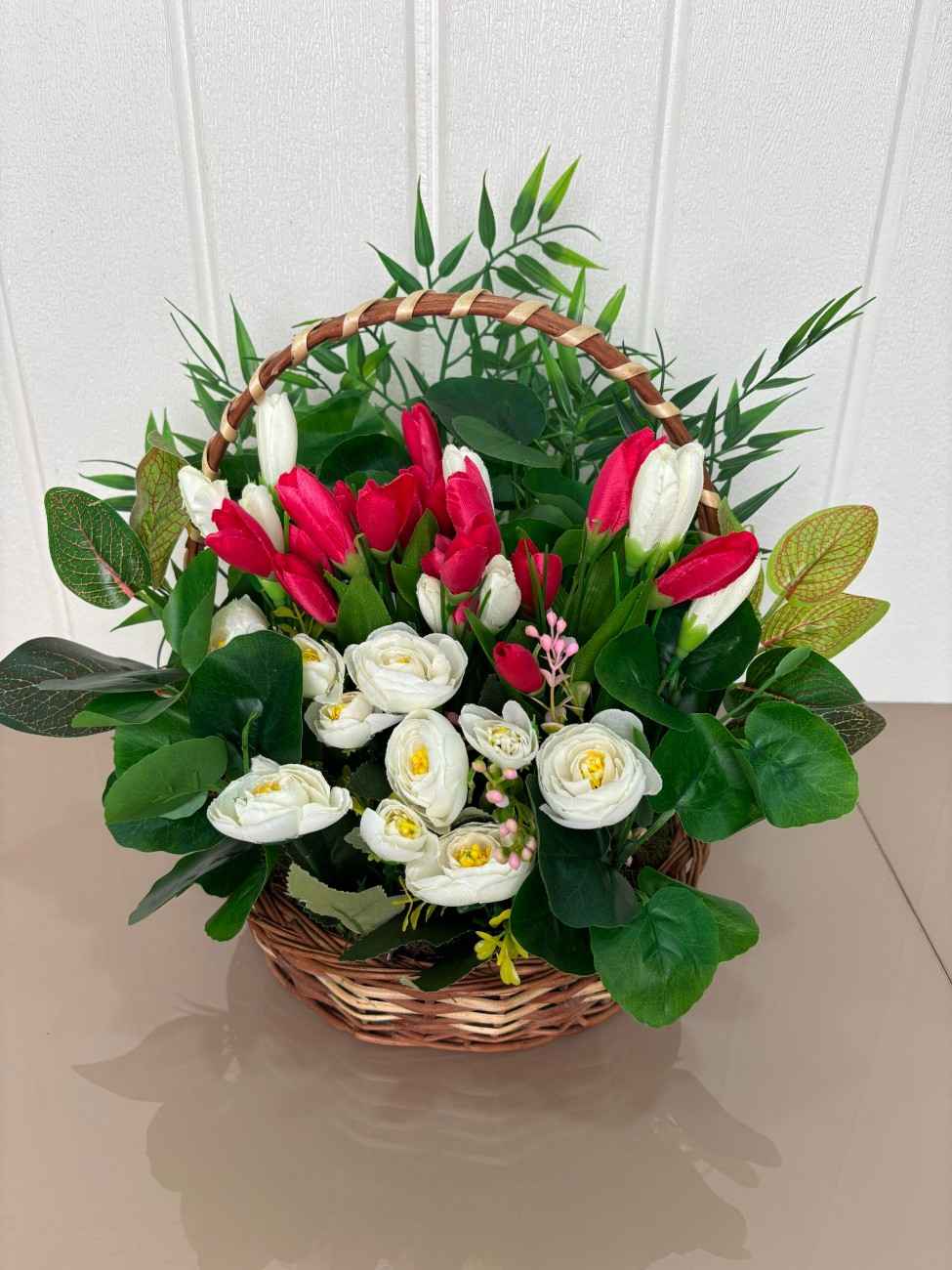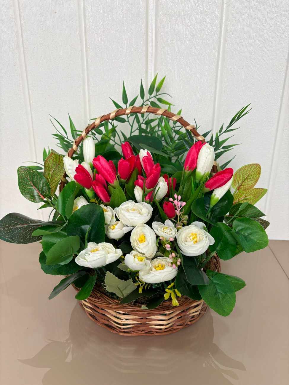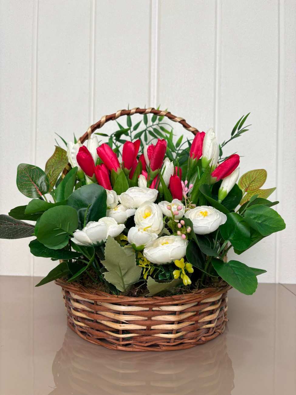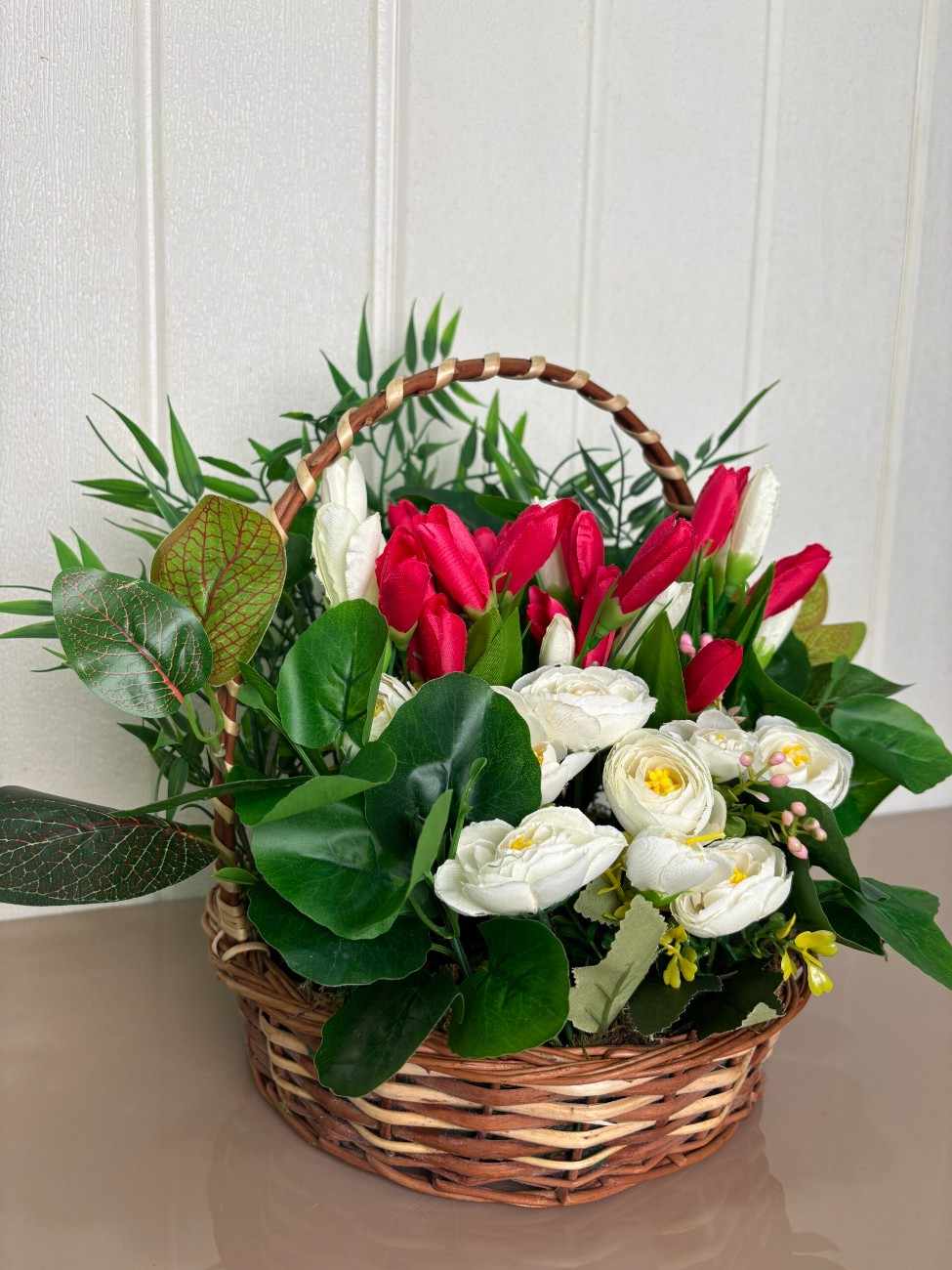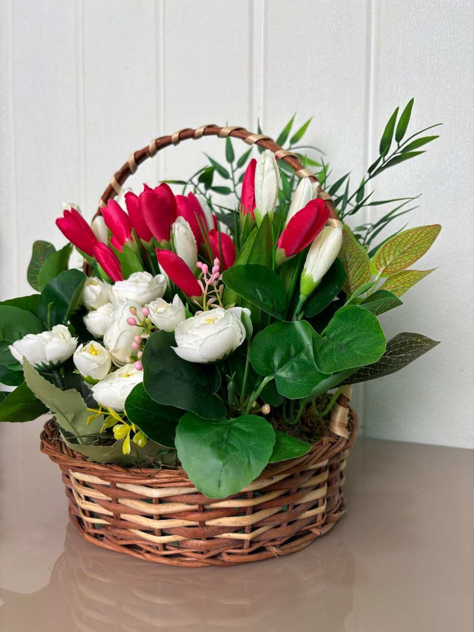 The basket showcases a striking combination of upright red and white artificial tulips, evoking a sense of renewal and cheer. These are beautifully accented by soft white artificial roses and a rich assortment of verdant green leaves, including some with subtle reddish undertones for added depth and realism. A touch of yellow filler flowers adds a delicate finishing touch.