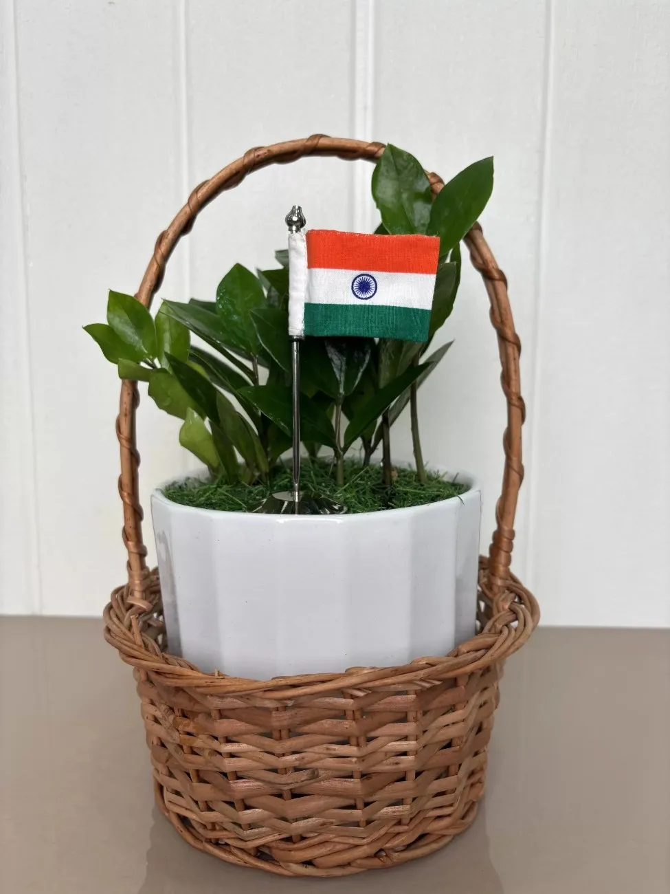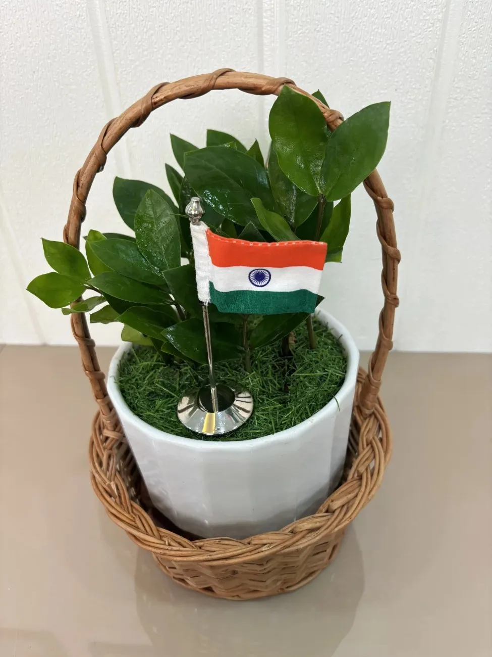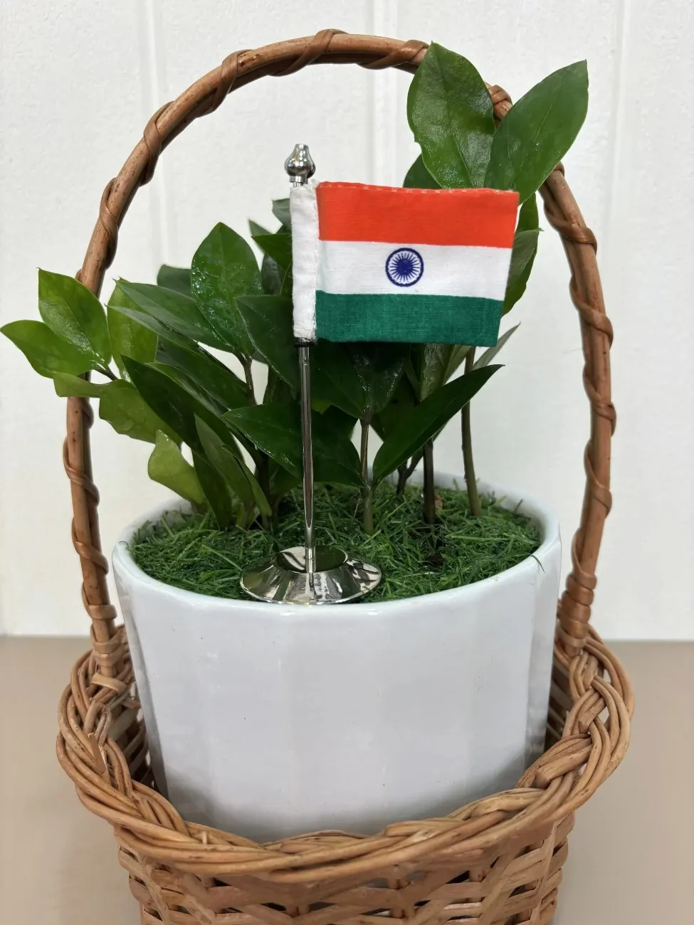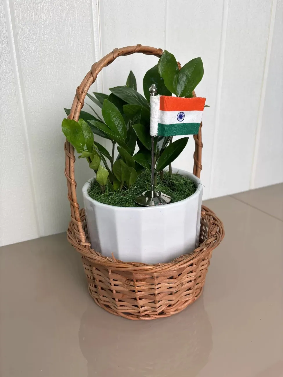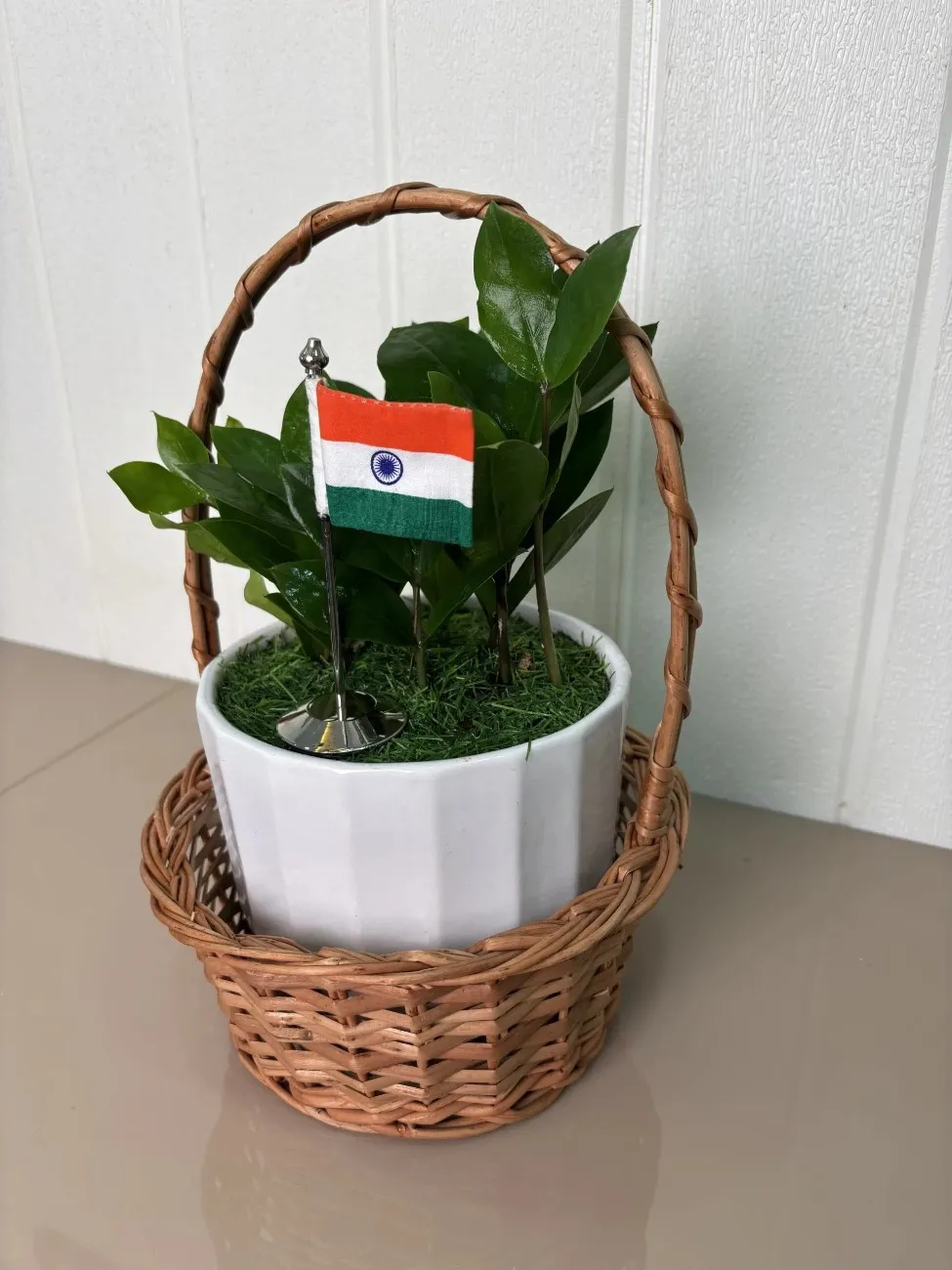 - Premium Patriotic Design – White ceramic pot with Indian flag in an elegant cane basket.
