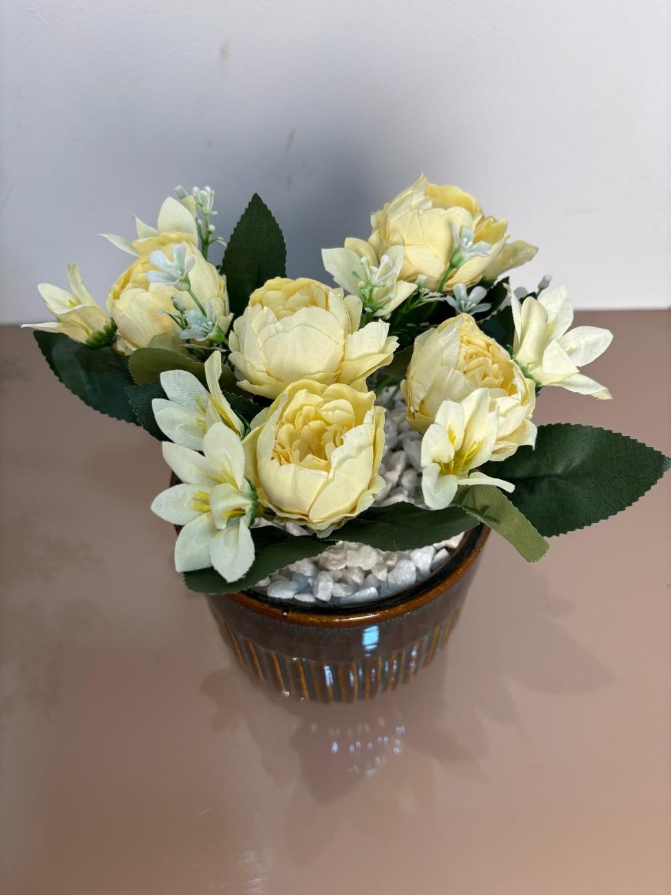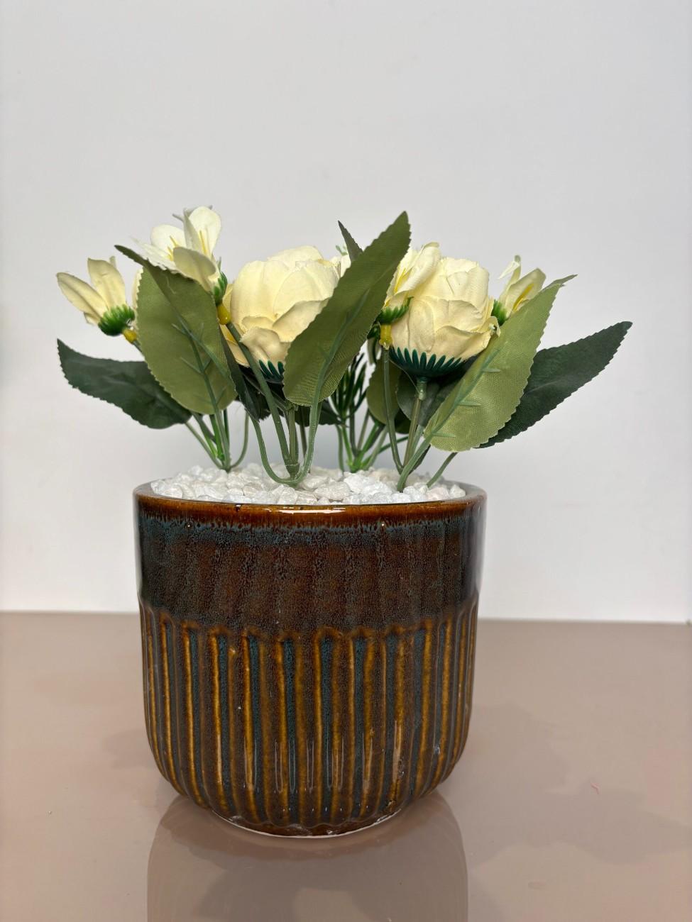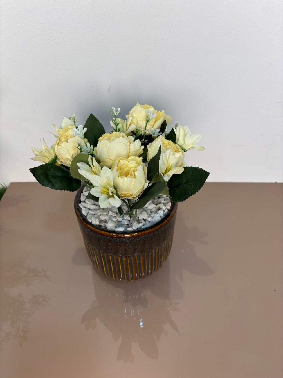 Bring a warm glow to your interiors with the “Yellow Bliss” artificial flower pot. Featuring delicate yellow roses and creamy blossoms, this compact arrangement sits in a glossy brown ceramic planter accented with white stones. Ideal for office desks, coffee tables, and gifting on casual occasions.
